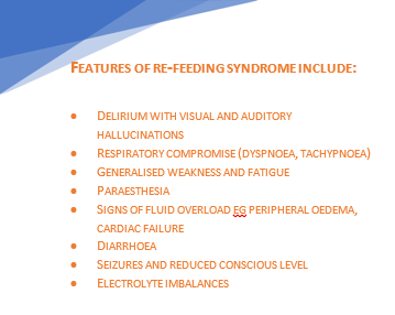 - Always consider re-feeding syndrome—monitor patient’s electrolytes (especially phosphate) before and during re-feeding, and assess the risk of re-feeding syndrome prior to starting feeding.